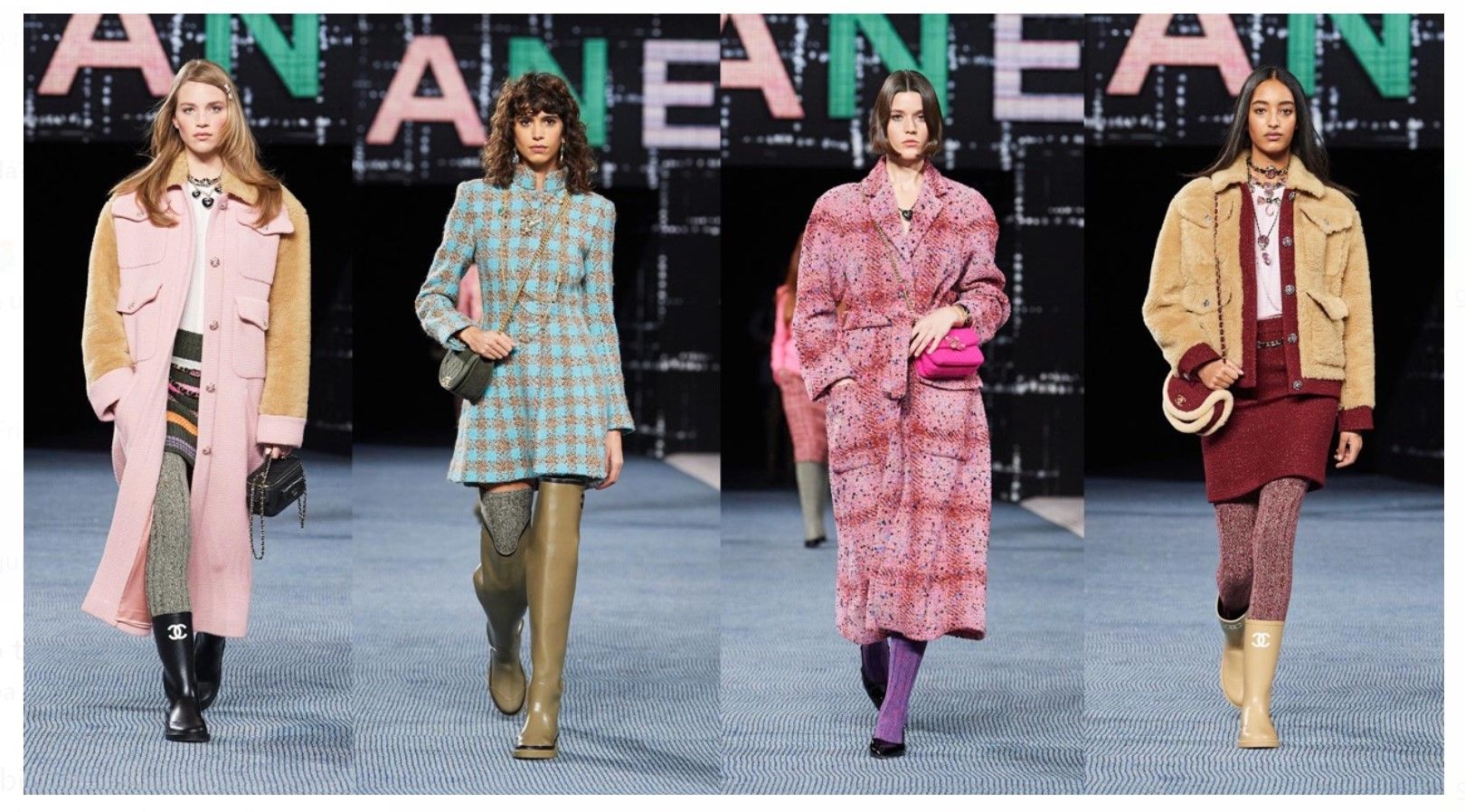 Sus siluetas mezclaban tweeds con prendas de cuero y denim, incluido los total looks. Los combinó con botas de goma estampadas con un logotipo de doble C, o zapatos negros de taco bajo, guillerminas y botas con taco chino.
