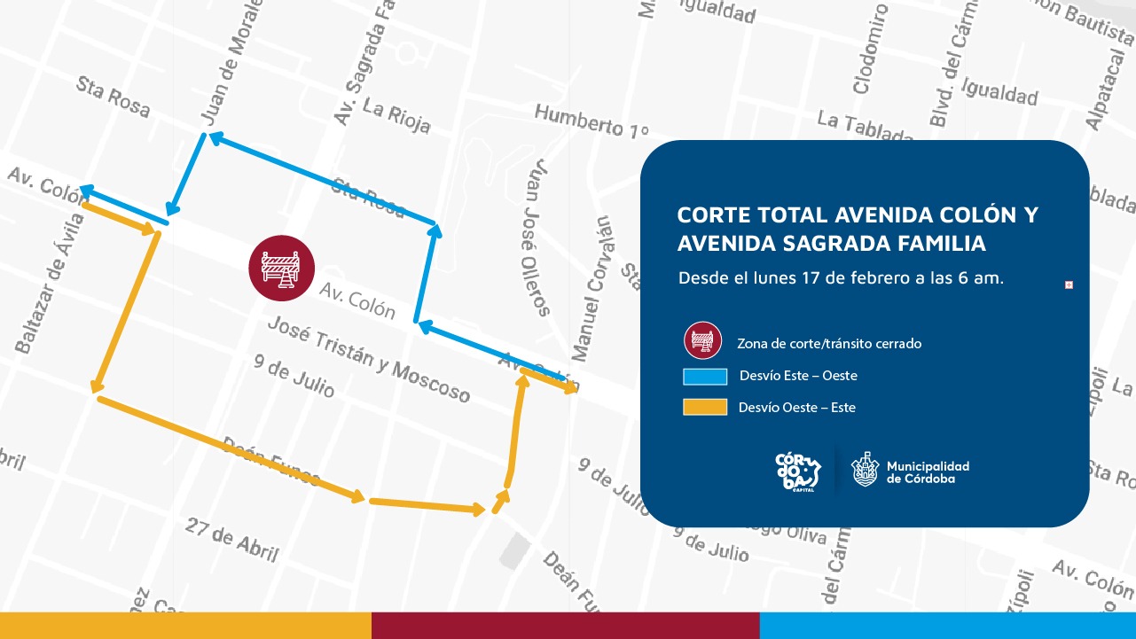 Con el inicio de nuevos trabajos en la obra de desagüe de Sagrada Familia, la Municipalidad de Córdoba realizará este lunes 17 de febrero desde las 6:00 un corte total de tránsito. Ocurrirá en el cruce de Sagrada Familia y Colón, prolongándose por alrededor de 10 días.