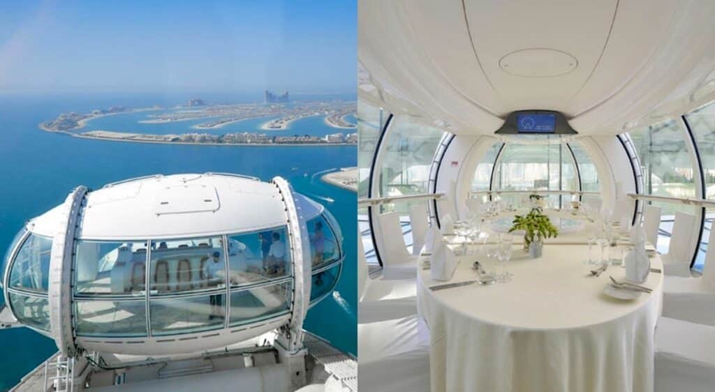 Una vez se sube comienza la experiencia con mayúsculas. Lleva alrededor de 38 minutos dar la vuelta completa, un tiempo que se puede emplear en una cabina de observación panorámica -por supuesto, con aire acondicionado para combatir el calor de Dubái- o en una opción mucho más exclusiva.