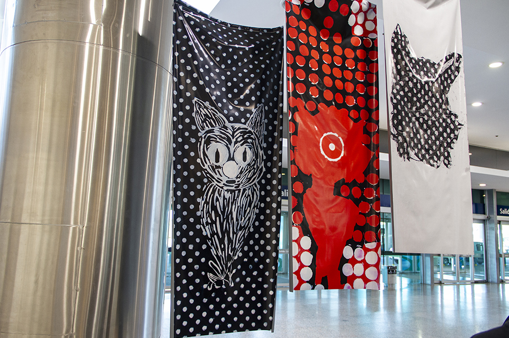La propuesta expositiva, curada por Ivana Fernández y Luli Chalub, presenta siete obras que concentran esperanzas y ternura en un espacio donde no imaginaríamos encontrar perros, gatos ni conejos: Propone poder mirar de cerca y con cuidado a otro ser. La pieza central, “Gatablanca” una imponente escultura de madera que supera los dos metros de altura y pesa 50 kilos, encabeza esta propuesta artística que busca tender puentes entre lo humano y lo no humano.