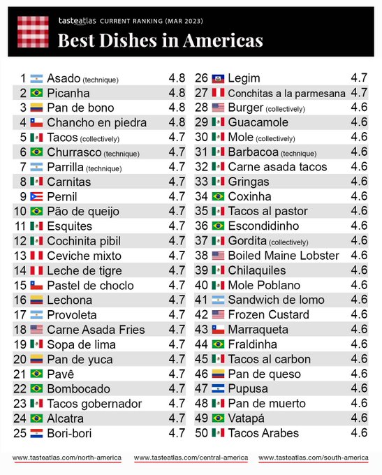 A través de su perfil oficial en Twitter, Taste Atlas compartió un listado que resume los 50 platos con mejor puntuación de América del Norte, Central y del Sur. Con el Asado en primer lugar como técnica culinaria, la clásica Picanha brasileña quedó en segundo lugar. En tercer lugar quedó el Pan de bono colombiano, mientras que en cuarto lugar el Chancho en piedra de Chile. Quinto en el podio se posicionaron los tacos, de México.
