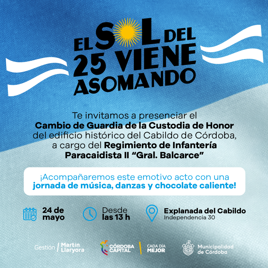 Este martes 24 de mayo, desde las 13 horas, la Municipalidad de Córdoba invita al festejo patrio con actividades gratuitas en la explanada del Cabildo Histórico (Independencia 30).