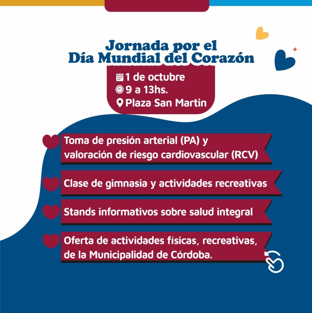 Con motivo del Día Mundial del Corazón, que se celebra cada 29 de septiembre, la Municipalidad de Córdoba, a través de la Secretaría de Salud desarrollará diversas actividades en diferentes puntos de la ciudad, de manera simultánea, en conjunto con otras secretarías y universidades.