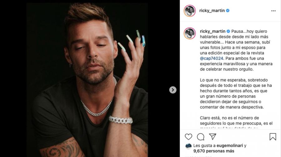 Los mensajes y saludos se multiplicaron en todas las redes sociales, pero uno de los más sentidos fue el que publicó Ricky Martin en su cuenta de Instagram. Allí, el cantante habló de sus sentimientos a partir de un hecho personal que le tocó atravesar recientemente. “Pausa… hoy quiero hablarles desde mi lado más vulnerable. Hace una semana, subí unas fotos junto a mi esposo para una edición especial de la revista CAP 74 024. Para ambos fue una experiencia maravillosa y una manera de celebrar nuestro orgullo”, comenzó relatando el cantante boricua.