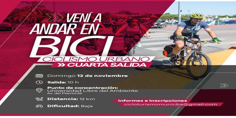 La Municipalidad de Córdoba a través de la Subsecretaría de Deporte y Recreación, dependiente de la Secretaría de Gobierno y Gestión General de Gabinete de la Municipalidad de Córdoba, invita a los vecinos y visitantes a participar del cuarto Paseo de Ciclismo Urbano que tendrá lugar el próximo domingo 12 de noviembre, desde las 10, con salida desde la Universidad Libre del Ambiente y una recorrida por los parques del Kempes, Chateau y Bustos.