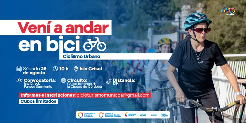 La Subsecretaría de Deporte y Recreación, dependiente de la Secretaría de Gobierno y Gestión General de Gabinete de la Municipalidad de Córdoba, invita a participar del Paseo de Ciclismo Urbano que tendrá lugar el próximo sábado 26 de agosto, desde las 10 horas, por el casco histórico de la Ciudad de Córdoba.
