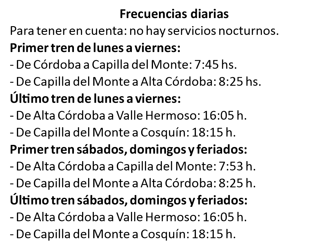 - No hay servicio directo entre la ciudad de Córdoba y Capilla del Monte, hay que hacer un trasbordo en Valle Hermoso.